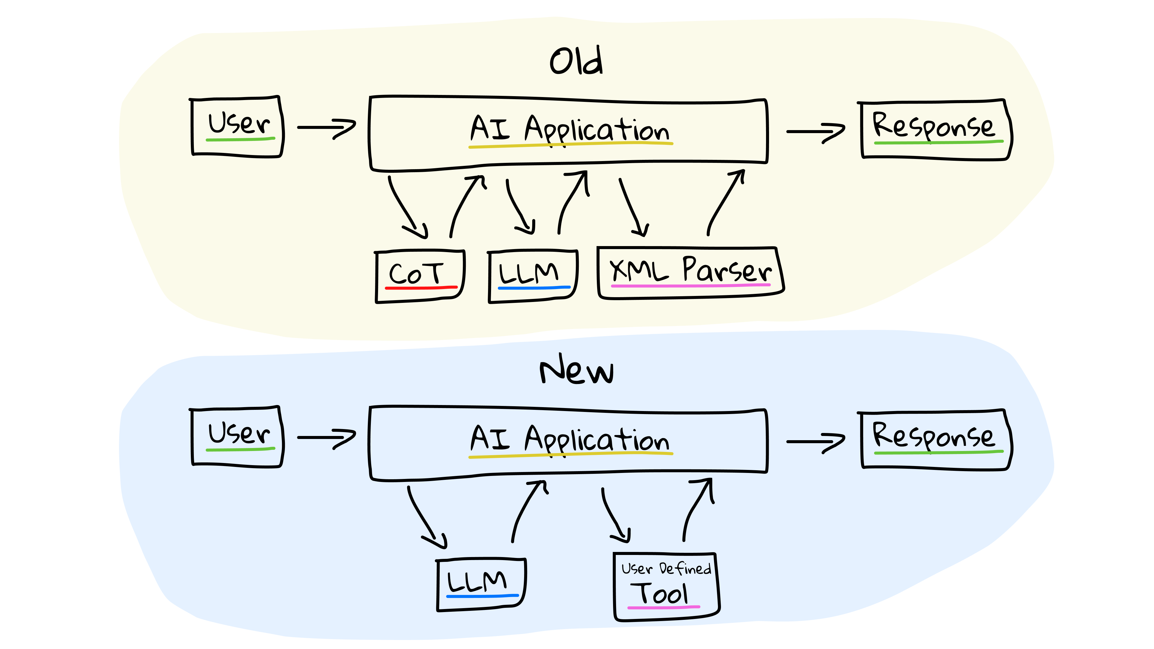 For our first example, let's wind back the clock to when function calling hadn't yet emerged as the standard for structured communication between applications and LLMs. AI Engineers post-processed each LLM request to parse out XML or JSON, advanced implementations supported streaming, fuzzy parsing and enforcing structured outputs. However, once the AI Labs introduced native function calling support, this entire processing step could be eliminated from the application layer.